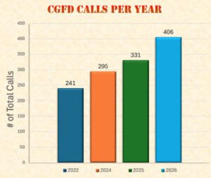 Firefighters responded to 75 more calls in 2025. Chief of the Department Alex Beauchamp commented, that call volume has steadily increased over the years. He added, the 100% volunteer department continues to meet the challenges of the increasing call volume through a number of initiatives. Noting the departments recent successful recruitment and retention efforts. - CGFD 2025 Santa Runs
